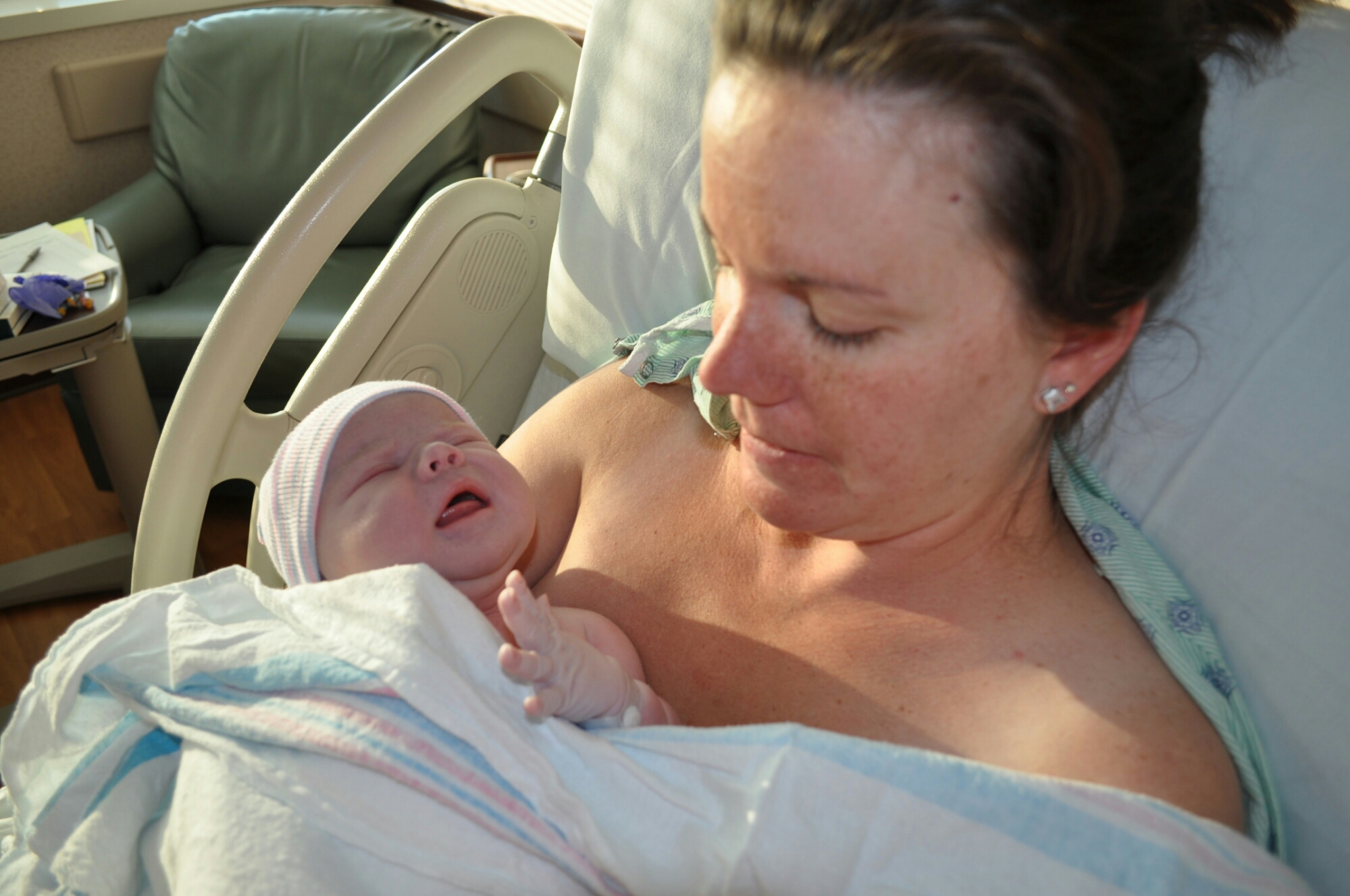 Later, after my placenta had been delivered and I was all stitched up, she was assessed and stable, they brought her to me, hooked up to a pulse machine, in a diaper, and let me hold her pale body skin to skin. We attempted to nurse, but it took her awhile due to all the trauma. I sang Jesus Loves Me to her, I cooed her and she settled. After an hour her color began to come back, she began to drink colostrum, and all was well.