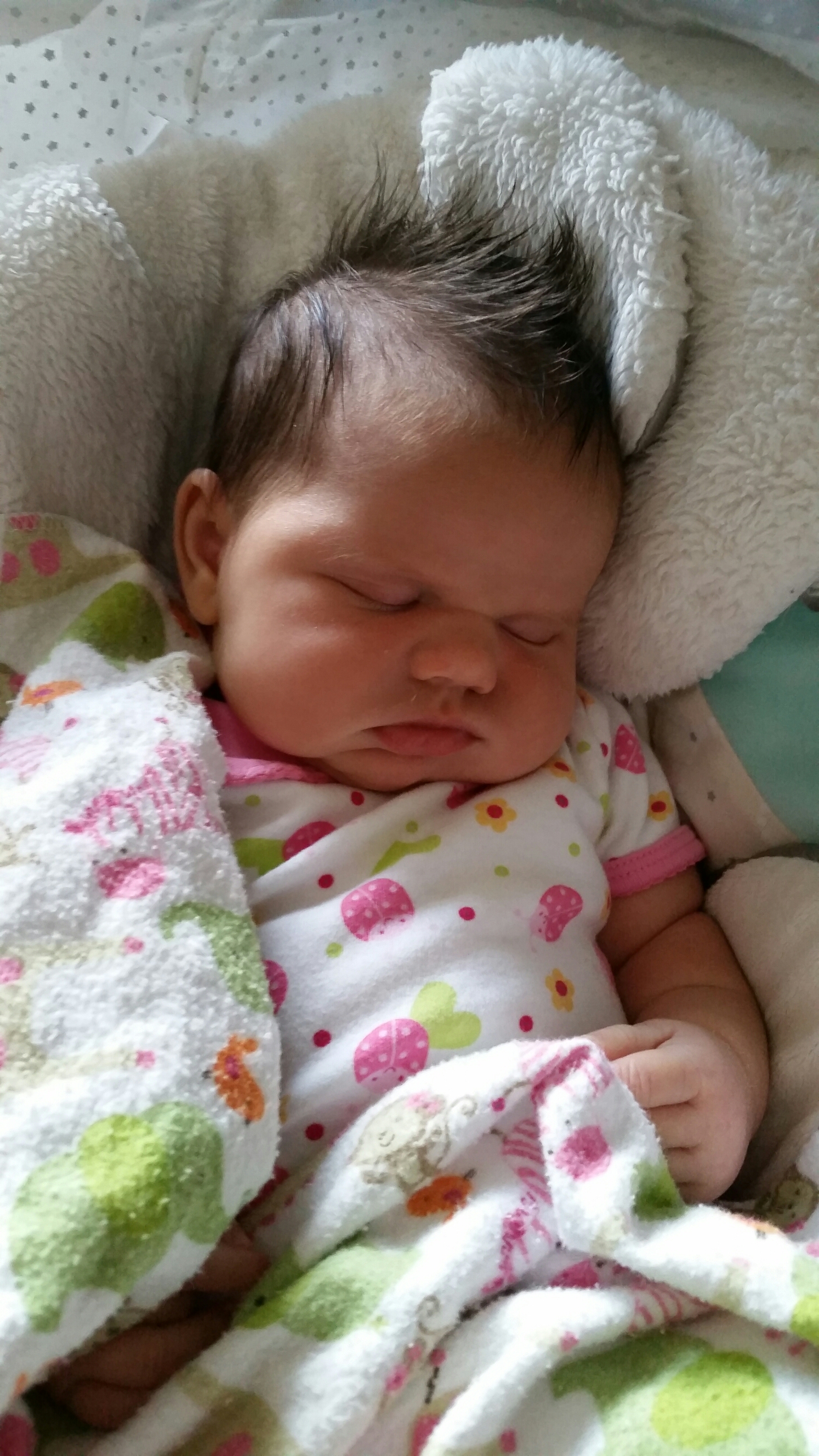 Her right arm was limp, she hardly moved it, but could still lightly grasp with her hand. They did not think it was a broken clavicle, but instead an issue with her brachial nerve. They told us physical therapy might be needed to help it to heal. In the meantime they wanted us to keep her arm in a sling position and not mash it against by body when we were breastfeeding. They described the incident of her shoulder getting stuck as shoulder dystocia. Her face, right breast, right arm, and right armpit were all pretty bruised up, but that will all heal… All of this news was scary and unexpected…but she is here,  she is alive and that is the most important at the end of the day. 9 lbs 14 oz, and 21″ with a head circumference of 37cm, she was a big baby. We spent the rest of the night snuggling, counting our blessings, and sharing the news of our daughter with friends and family.